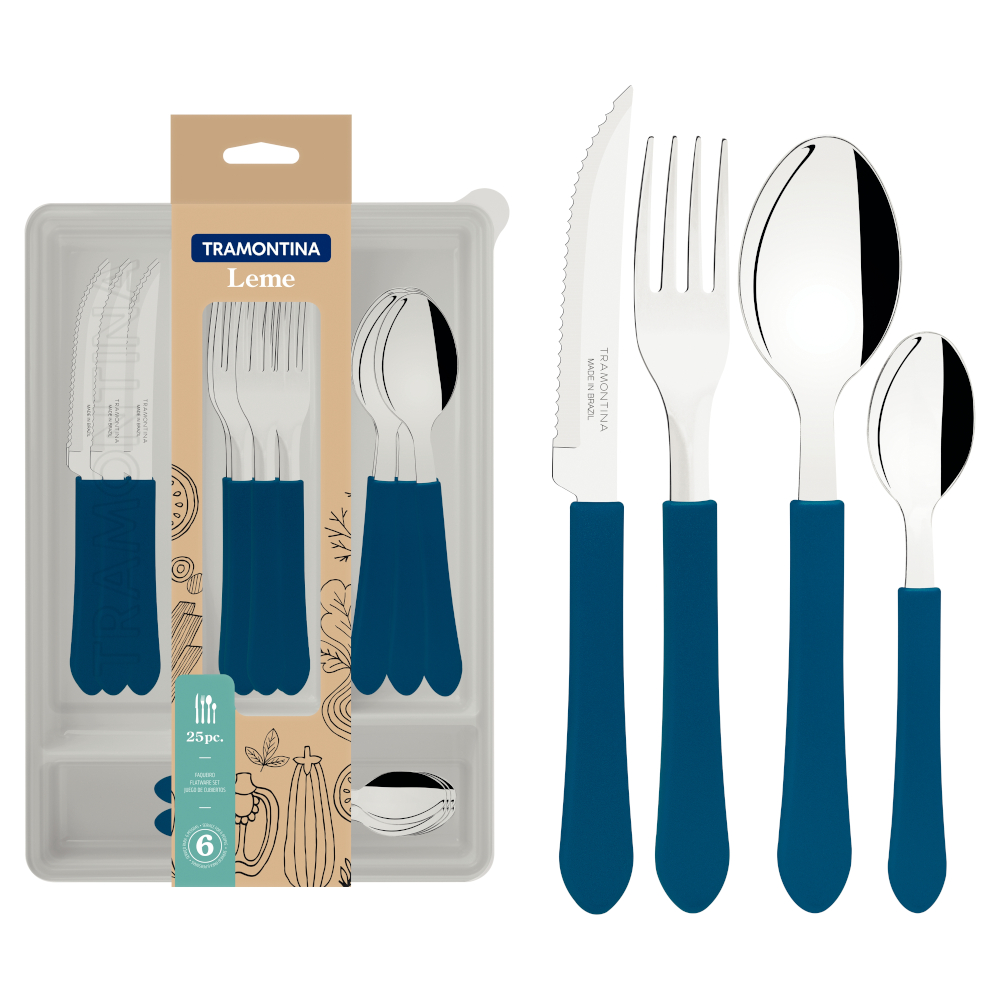 Para completar sus comidas e incorporar mucho más color a su mesa, cuente con el juego de cubiertos Tramontina Leme con láminas en acero inoxidable y mangos de polipropileno azul océano con cajonera de 25 piezas. Con piezas producidas con láminas de acero inoxidable y mangos desarrollados en polipropileno, es resistente, durable y hace que el momento de disfrutar su comida preferida sea aún más especial. También es muy fácil de limpiar y es apto para lavavajillas, lo que facilita mucho más su rutina en la cocina. Además, incluye una cajonera plástica, un accesorio perfecto para que almacene y guarde los cubiertos en su cajón. ¡Con Tramontina tiene lo mejor para su cocina!
