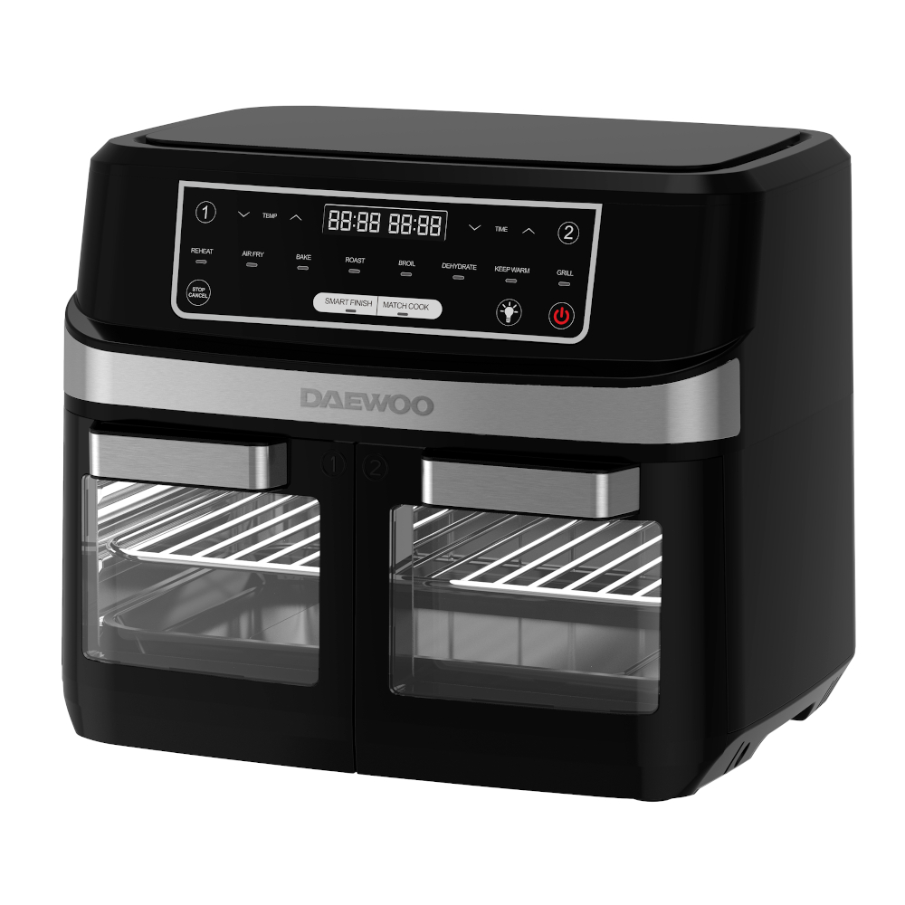 La función «Smart Finish» asegura que ambos ciclos de cocción finalicen simultáneamente, incluso con ajustes diferentes. El display LED táctil y el control digital ofrecen un manejo intuitivo, con temperatura regulable de 50 a 200°C y temporizador de 60 minutos para un control total. Con 8 funciones preestablecidas, desde recalentar hasta cocción sin aceite, este electrodoméstico te invita a explorar sabores y texturas.